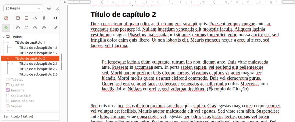 O uso do Estilos de parágrafos e hierarquia de títulos também tem grande importância para que você se mantenha organizado na sua escrita. Abaixo temos uma imagem que mostra o recurso Navegador do LibreOffice Writer, que pode ser acessado no Menu Exibir ou na tecla de atalho <F5>.